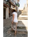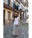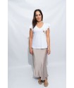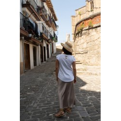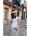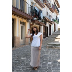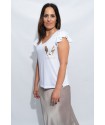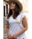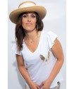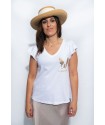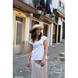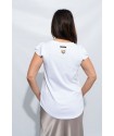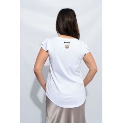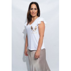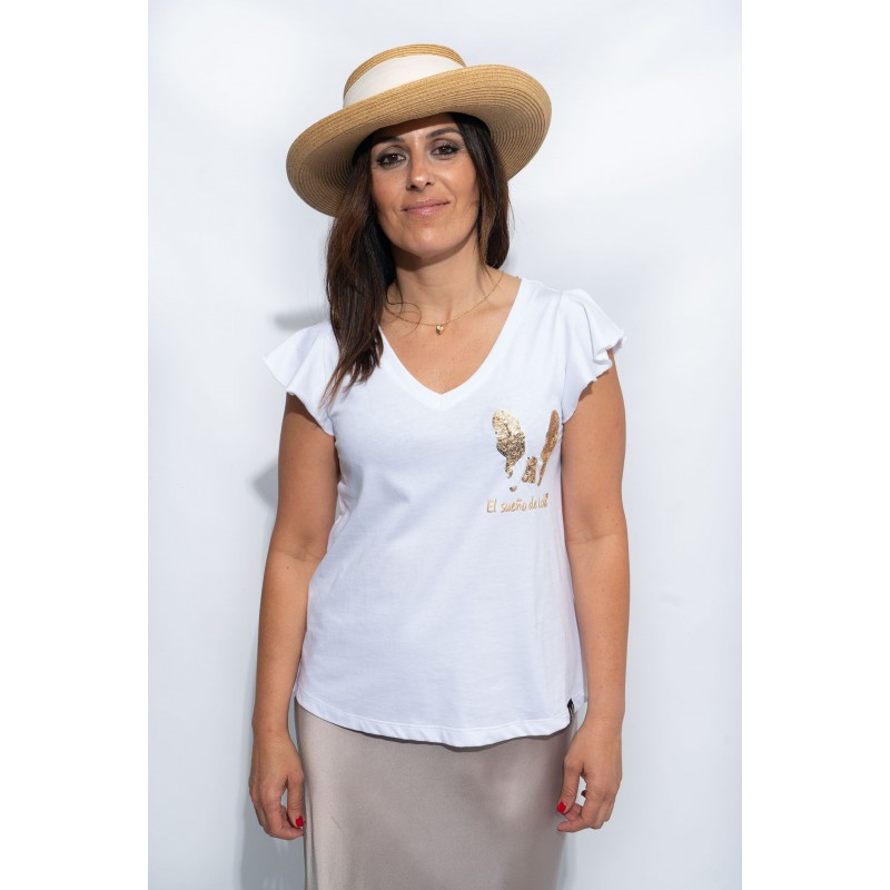 Camiseta Loluca Gold de El Sueño de Lola. Camiseta blanca con cuello pico y manga de volante muy favorecedora y original. Lleva bordado en el pecho en pailletes dorados el logo de la marca así como un corazón en la parte superior trasera.