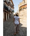 Camiseta Mi Estrella Favorita de El Sueño de Lola. Camiseta de manga sisa con hombreras, en color blanco y con un novedoso nudo central muy original y detalle de estrellas boradas en lurex negro en el hombro izquierdo, así como corazón alado en la parte superior de la espalda.