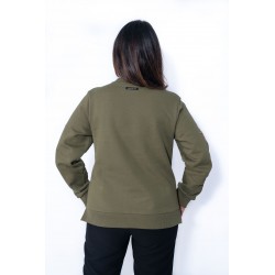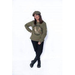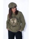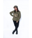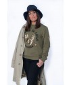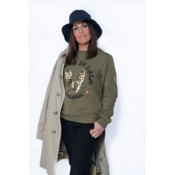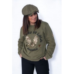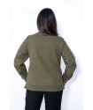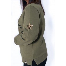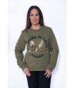 En la parte frontal, bolsillos laterales y debajo la frase"Nunca es tarde para volar" en color dorado y adornado con tachuelas en forma de estrellas.