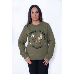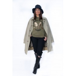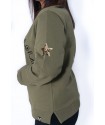Maxi bordado en la espalda de dos altas en color dorado adornadas con estrellas y un corazon en el centro hecho con pequeñas tachuelas doradas.