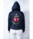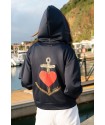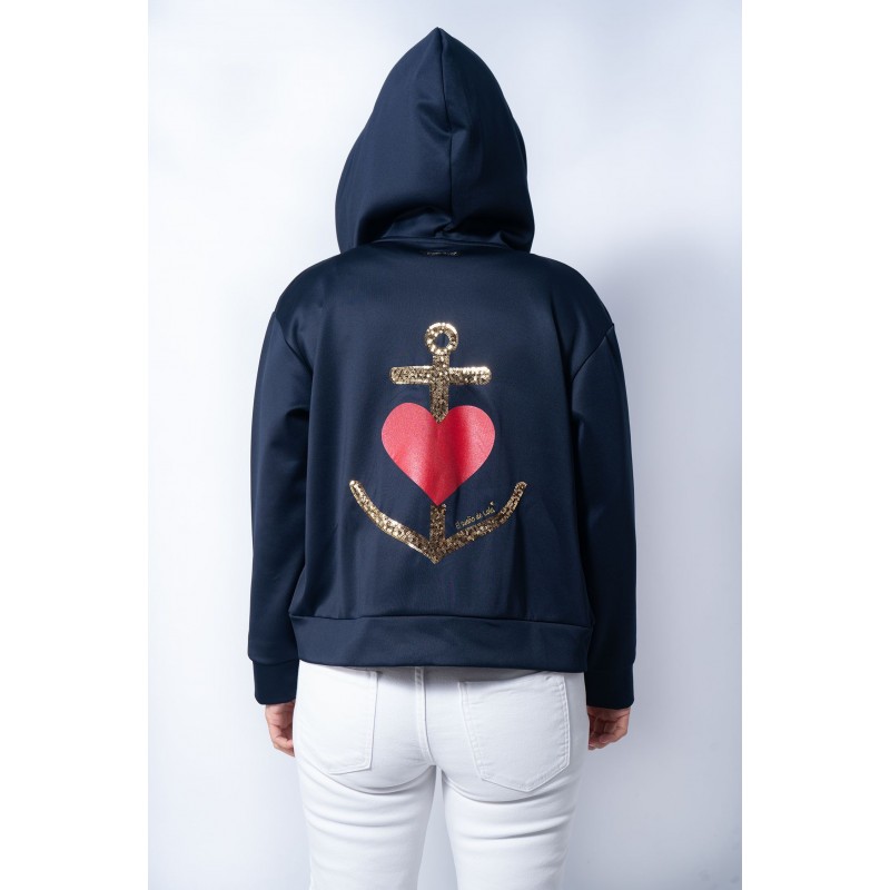 Sudadera con cremallera frontal, detalle de corazon rojo en la zona delantera en el pecho y maxi print trasero, con una gran ancla con pailettes dorados (pequeñas lentejuelas) y un gran corazon rojo en el centro en glitter.