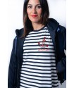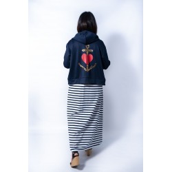 Detalle de corazon rojo en la espalda e ilustracion ancla love bordada en la parte delantera.