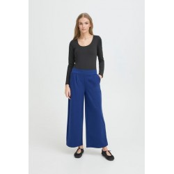 Pantalon Kate Ancho Tobillero Blueprint ICHI. Pantalon de tiro alto, con elastico en la cinturilla para un mejor ajuste y fajin delantero. Lleva dos pinzas en el frontal lo que estiliza mucho la figura y facilita resalta la figura con los bolsillos laterales.