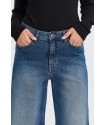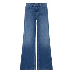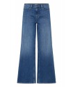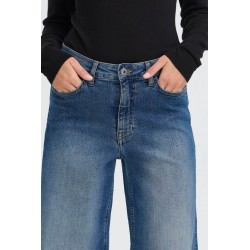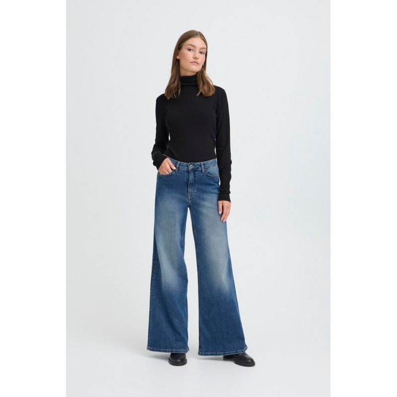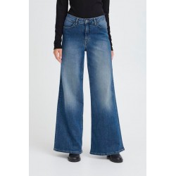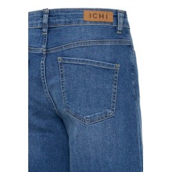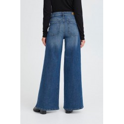 Pantalon Twiggy Wide Medium Blue de la marca ICHI. Pantalón vaquero azul con efecto desgastado, de pernera ancha, tiro alto y largo completo. Ofrece una silueta relajada y versátil ideal para un look causal y moderno. Dispone de cinco bolsillos.