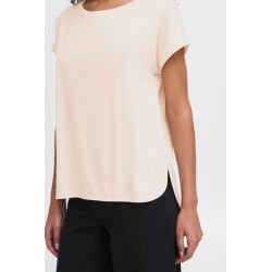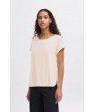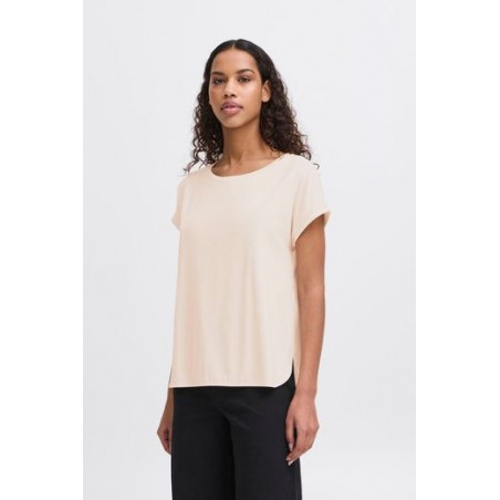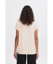 Camiseta Rebel 6 Tapioca de la marca ICHI. Camiseta en un color beige suave o crema con brillo, de corte holgado, cuello redondo y manga corta. Ligeramente más larga por la parte de atrás, con aberturas laterales y bajo curvo. De tejido suave y cómodo, ideal para el día a día. Combínalo con un estilo informal con cualquier vaquero que ofrece la marca o incluso con los trajes para un estilo más serio pero cómodo.