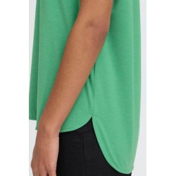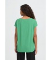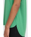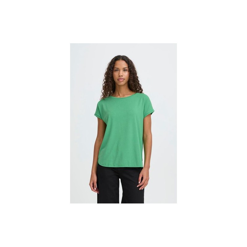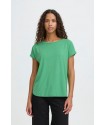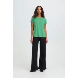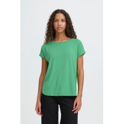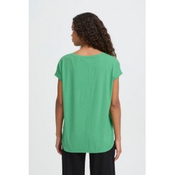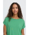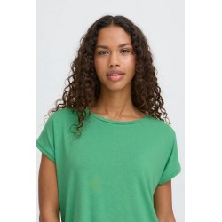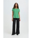 Camiseta Rebel 6 Kelly Green de la marca ICHI. Camiseta en un color verde intenso con brillo, de corte holgado, cuello redondo y manga corta. Ligeramente más larga por la parte de atrás, con aberturas laterales y bajo curvo. De tejido suave y cómodo, ideal para el día a día. Combínalo con un estilo informal con cualquier vaquero que ofrece la marca o incluso con los trajes para un estilo más serio pero cómodo.
