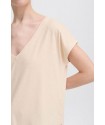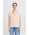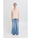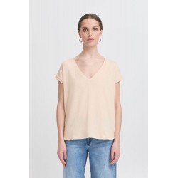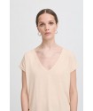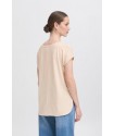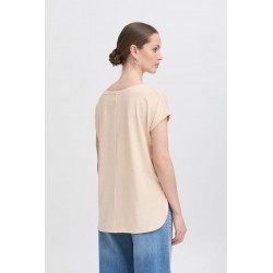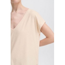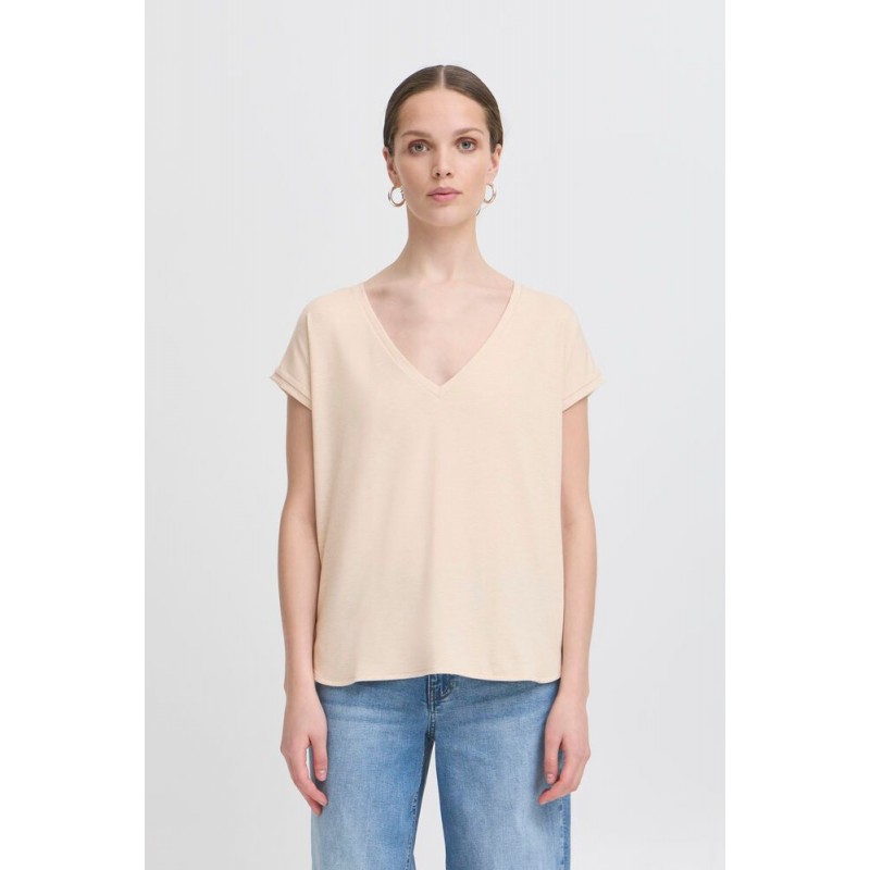 Camiseta Rebel 12 Tapioca de la marca ICHI. Camiseta en un color beige suave o crema con brillo, de corte holgado, cuello pico muy favorecedor y manga corta. Ligeramente más larga por la parte de atrás, con aberturas laterales y bajo curvo. De tejido suave y cómodo, ideal para el día a día. Combínalo con un estilo informal con cualquier vaquero que ofrece la marca o incluso con los trajes para un estilo más serio pero cómodo.