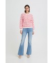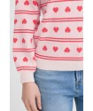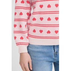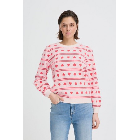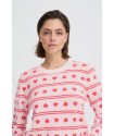 Jersey Brielle 7 Teaberry de la marca ICHI. Jersey de corte cómodo, flojito, con cuello redondo y realizado en punto doble, más abrigado para los días más frescos de esta temporada. Con diseño de corazones en líneas verticales, muy juvenil y atemporal.