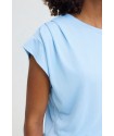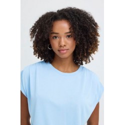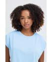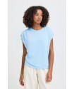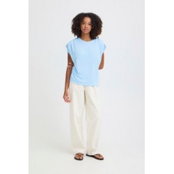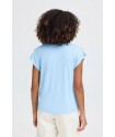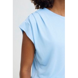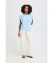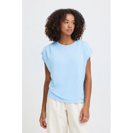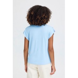 Camiseta Lisken To Powder Blue de la marca ICHI. Camiseta ámplia de silueta recta, cuello redondo y detalles plisados en los hombros que le aportan elegancia y textura. Realizada en azul cielo, un color que no sólo llevarás en esta temporada de primavera sino que en verano te dará un juego increible con tus looks playeros y el tono más moreno que lucirás en tus vacaciones. Una camiseta de tacto suave que podrás combinar con alguno de los trajes que ofrece la marca o utilizar con un vaquero para un estilo informal y cómodo.