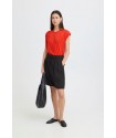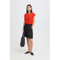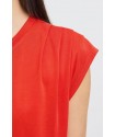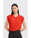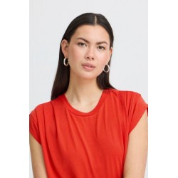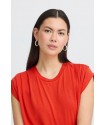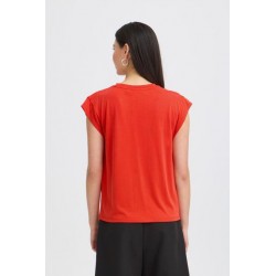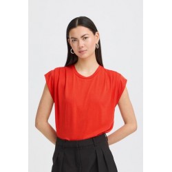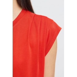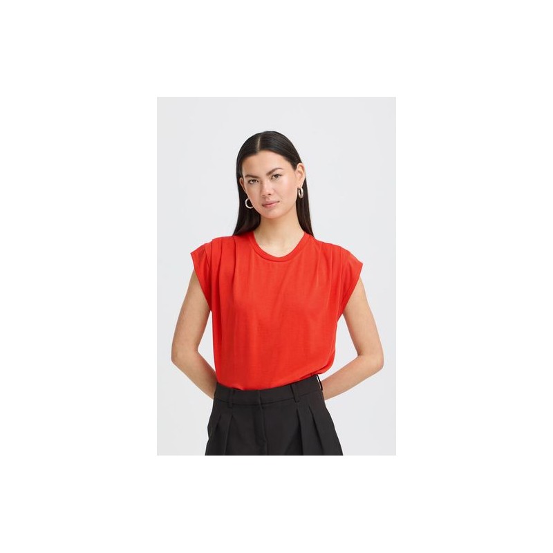 Camiseta Lisken To Fiery Red de la marca ICHI. Camiseta ámplia de silueta recta, cuello redondo y detalles plisados en los hombros que le aportan elegancia y textura. Una camiseta de tacto suave que podrás combinar con cualquiera de los trajes que ofrece la marca o utilizar con un vaquero para un estilo informal y cómodo.