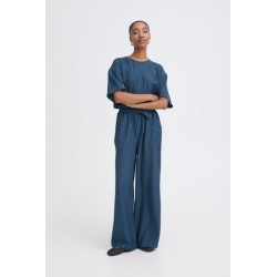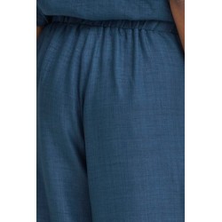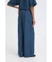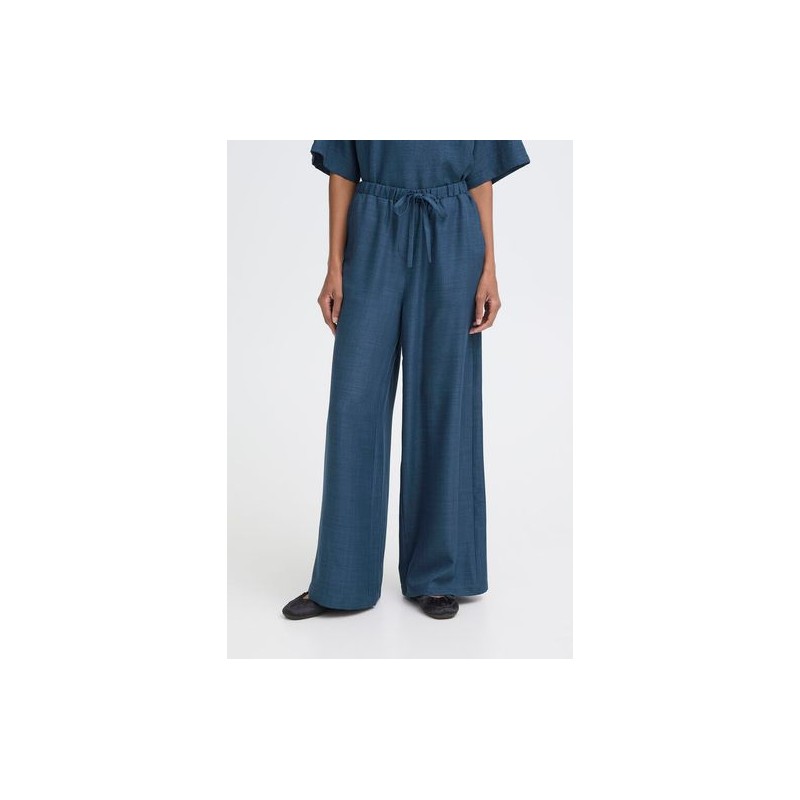 Pantalon Katiko True Navy Melange de la marca ICHI. Pantalon de tiro alto, con elástico en la cinturilla para un mejor ajuste y cordón. Es un pantalón fluído, con pernera ancha y recta en color vaquero, ideal tanto para la temporada de primavera como la de verano gracias a su ajuste relajado y silueta vaporosa.