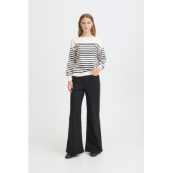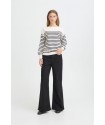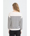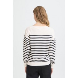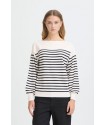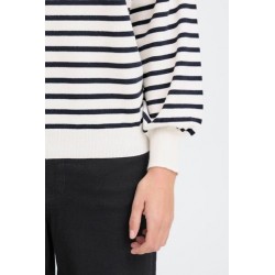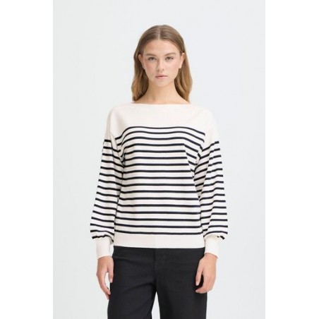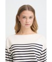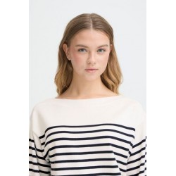 Jersey Luls Boat Neck Solid + White Stripe de la marca ICHI. Jersey a rayas marineras combinando un fondo blanco con la raya fina en azul marino. De cuello barco y manga larga acabada en puño ancho. De silueta relajada, ideal para esta temporada.