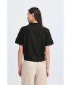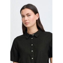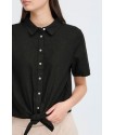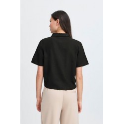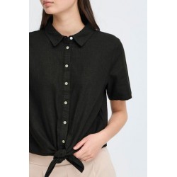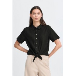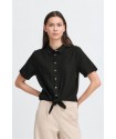 Blusa Linno 2 Black de la marca ICHI. Blusa negra de patrón camisero, con cuello de solapa y de cierre de botones en color blanco a conttraste. De manga corta y con detalle de lazada en el bajo que le da un aire más informal.