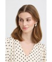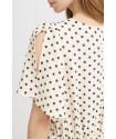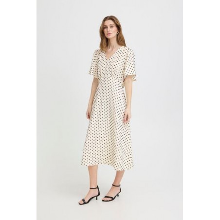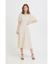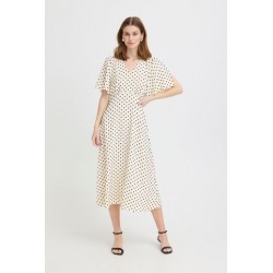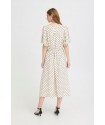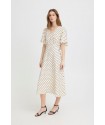 Vestido Zabby Graphic Diamond de la marca ICHI. Vestido de corte midi en color beige muy clarito, con detalle de lunares cosidos en relieve, de cuello pico y manga corta fluída abierta en la parte superior. Presenta corte en la cintura con parte trasera con elástico para mejor ajuste al cuerpo. Vestido fluído y cómodo ideal para el día a día.