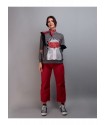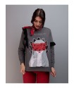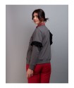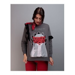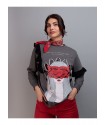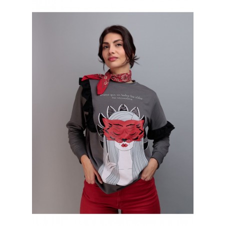 Sudadera Salvaje de Keep & Trendy. Sudadera de manga larga, con base en color gris e ilustracion frontal de una chica, con una mascara roja, en tonos blancos y negros a contraste contra el fondo.