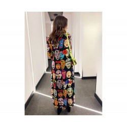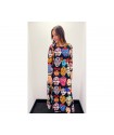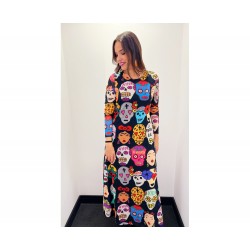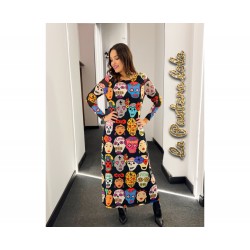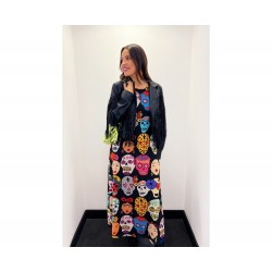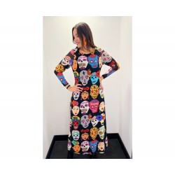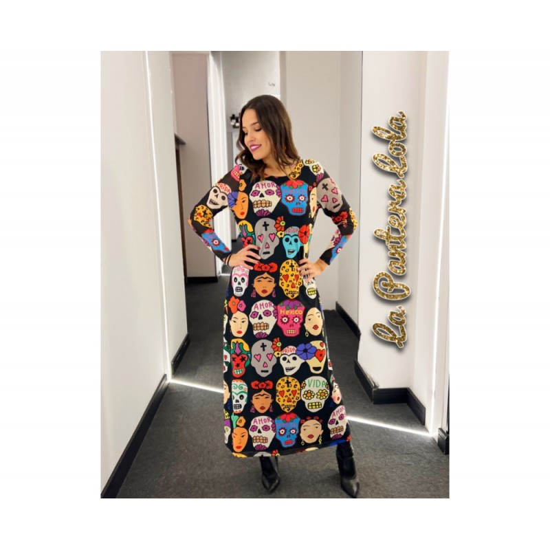 Vestido Viva Mexico de La Pantera Lola. Vestido largo de tul elástico con forro en su interior. Con base en color negro y totalmente estampado en tributo a México.