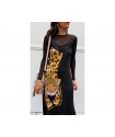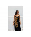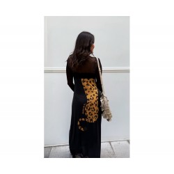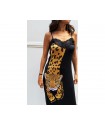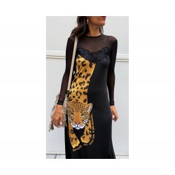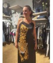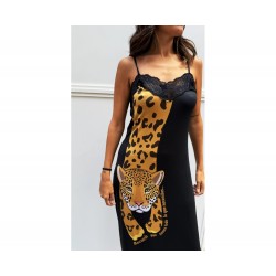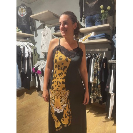 Vestido Lencero Sauvage de La Pantera Lola. Vestido lencero largo, con base en color negro y print de un leopardo mirando hacia abajo, tanto en la parte frontal como en la zona de la espalda.