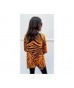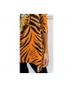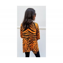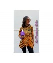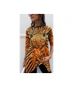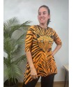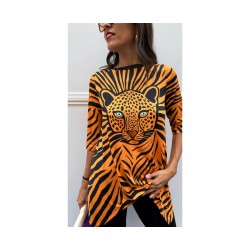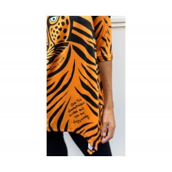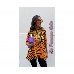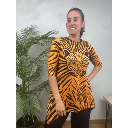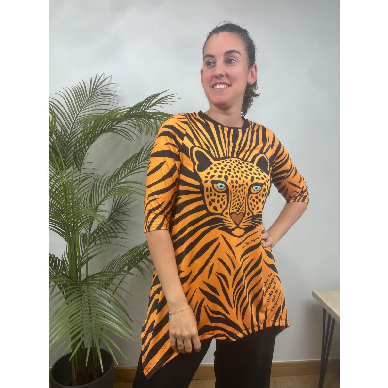 Camiseta Sueños Naranja de La Pantera Lola. Camiseta en un patrón asimétrico muy estiloso que le aporta un movimiento increible. Print a rayas naranja y negro y frontal con ilustracion de una pantera con la siguiente frase "Que tus nuevos sueños brillen mas que tus viejos miedos".