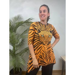 Camiseta Sauvage de La Pantera Lola. Camiseta en un patrón asimétrico muy estiloso que le aporta un movimiento increible. Print combinado animal print con otros elementos como son las calaveras, estrellas, rayos... y una pantera en el bajo frontal izquierdo.