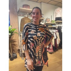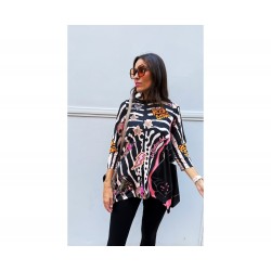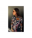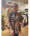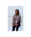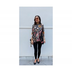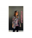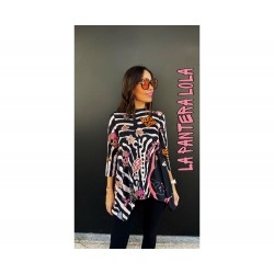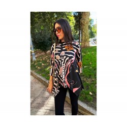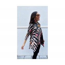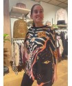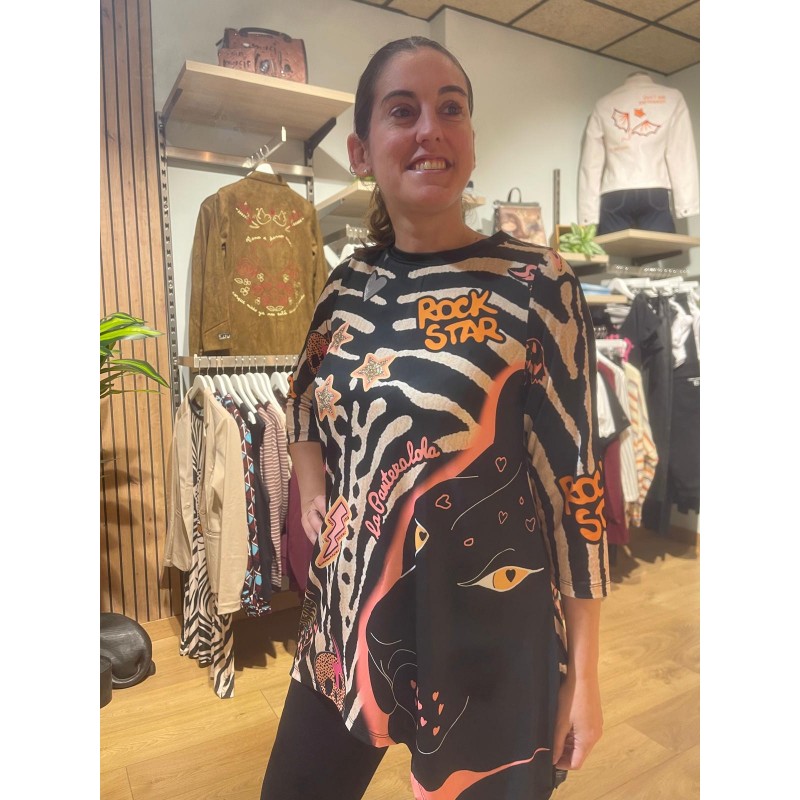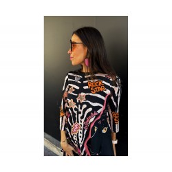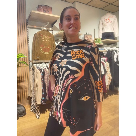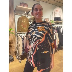 Camiseta Sauvage de La Pantera Lola. Camiseta en un patrón asimétrico muy estiloso que le aporta un movimiento increible. Print combinado animal print con otros elementos como son las calaveras, estrellas, rayos... y una pantera en el bajo frontal izquierdo.
