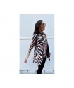 Escote redondeado y tejido fluido, en un vestido corto con total print de cebra en crudo y negro, con maxi print frontal de una pantera y la frase "Que tus nuevos sueños brillen mas que tus viejos miedos"