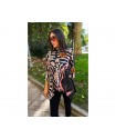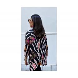 Blazer Sauvage de La Pantera Lola. Chaqueta tipo blazer de corte recto y oversize, de tela efecto neopreno, muy ligera y elástica. Print combinado animal print con otros elementos como son las calaveras, estrellas, rayos... y una pantera en el bajo frontal izquierdo.