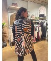 Escote redondeado y tejido fluido, en un vestido corto con total print de cebra en crudo y negro, con maxi print frontal de una pantera y la frase "Que tus nuevos sueños brillen mas que tus viejos miedos"
