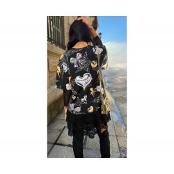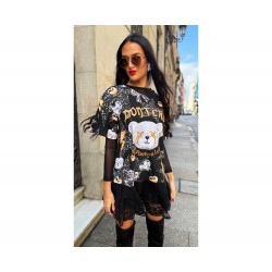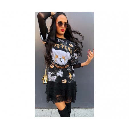 Vestido Don´t Cry de La Pantera Lola. Vestido corto, de manga corta, con triple volante de encaje en el bajo, que no transparenta nada, y estampado de estrellas, corazones, rayos, lazos y cabezas de oso en tonos plateado y dorado sobe fondo negro. En el frontal gana protagonismo la cabeza de oso en un mayor tamaño con la frase "don´t cry" sobre él y el nombre de la marca bajo el mismo . Nuevo patrón con un corte muy cómodo y ámplio.