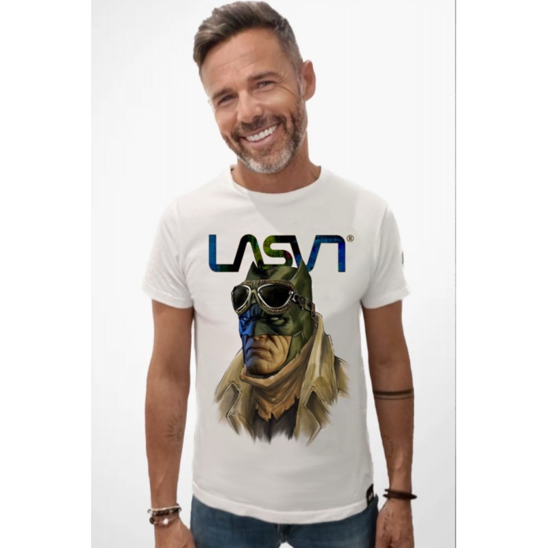 Camiseta Chico LASAL Desert Blanca. Camiseta regular fit de manga corta y cuello redondo en color blanco. Estapación delantera cuatrimetría al agua combinada con digital de Batman con abrigo y gafas para el desierto.