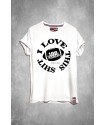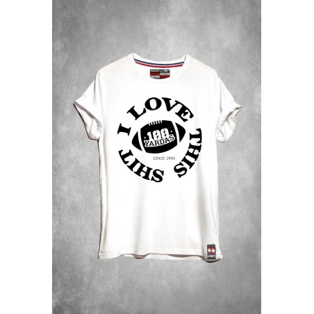 Camiseta Chico LASAL 100 Yardas Love Blanca. Camiseta en color blanco con manga corta. Dispone de bordados de 100 yardas en ambas mangas y de estampado delantero en color negro de un balón de fútbol de 100 yardas reodeado de la frase "i love this shit" y "since 1990".