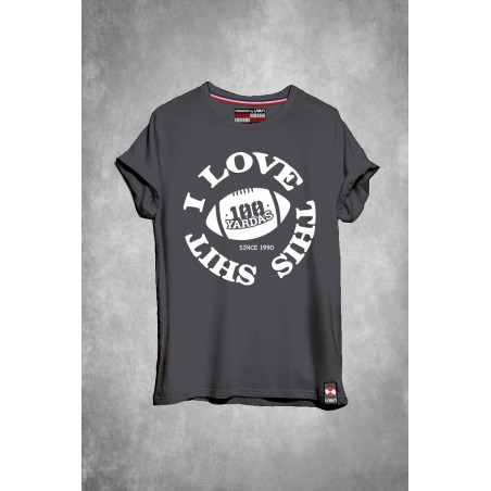 Camiseta Chico LASAL 100 Yardas Love Negra Desgastada. Camiseta en color negro desgastado con manga corta. Dispone de bordados de 100 yardas en ambas mangas y de estampado delantero en color blanco de un balón de fútbol de 100 yardas rodeado de la frase "i love this shit" y "since 1990".
