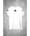 Camiseta exclusiva de mujer Show Blanca. Camiseta en color blanco, con apliaciones exclusivas de la marca en los hombros, cuello pico y manga sisa. Estampacion delantera digital de una chica de perfil vestida de bufón en el que resalta sobre los tonos grises el maquillaje rojo de sus labios y pómulos, junto a la frase "show must go on".