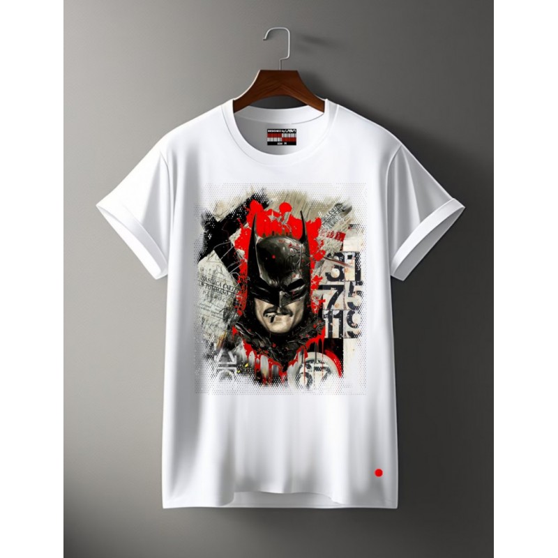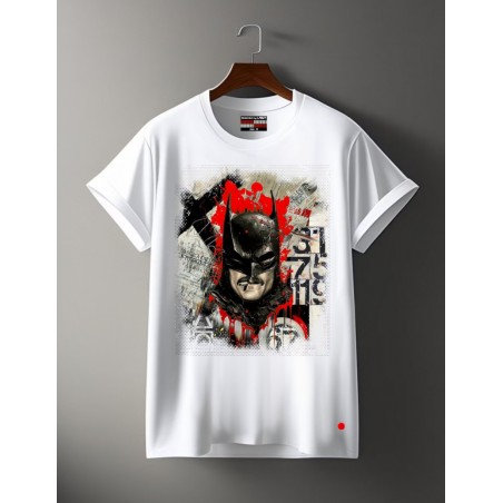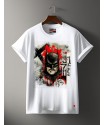 Camiseta Chico LASAL BASILICA Blanco. Camiseta de manga corta, en color blanca, con dibujo frontal de Batman, fumando un cigarro y sobre un fondo en tonos rojos y beige.