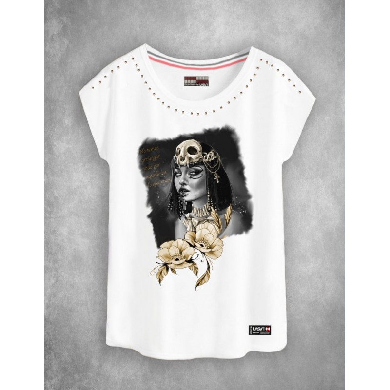 <p>Maxi print frontal de cleopatra en tonos grises y dorados junto con dos flores doradas y la frase "No temas arriesgar todo por aquello en lo que crees":</p>