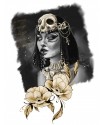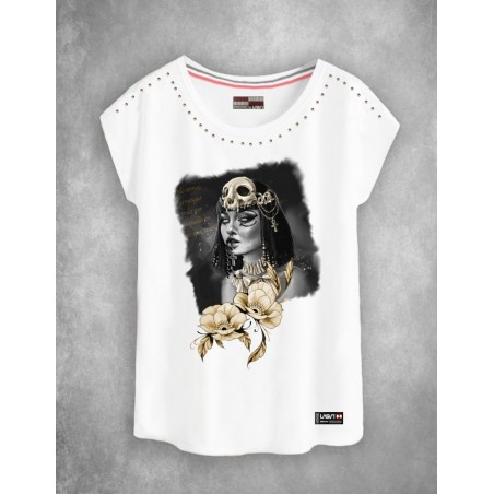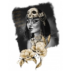 Maxi print frontal de cleopatra en tonos grises y dorados junto con dos flores doradas y la frase "No temas arriesgar todo por aquello en lo que crees":