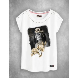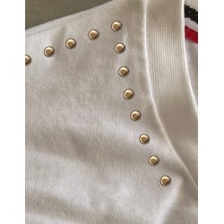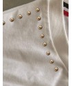 Camiseta exclusiva de mujer Temer Blanca. Camiseta en color blanco, de cuello redondo amplio, con manga caída y aplicaciones tipo swarovski bordeando en cuello y en dirección a las mangas en color dorado.