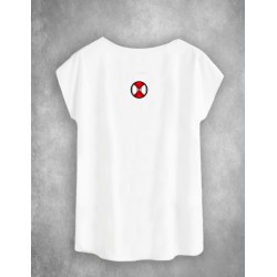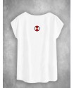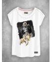 Camiseta exclusiva de mujer Joke Blanca. Camiseta en color blanco, sin mangas y con cuello redondo. Maxi print frontal de una payasita y un arlequín en tonos grises, destacando en tono azul el logo de la marca y la frase "LIFE IS A JOKE", junto con la rosa y otros elementos. Como detalle, la bola del gorro del arlequín representa el logo de la marca.