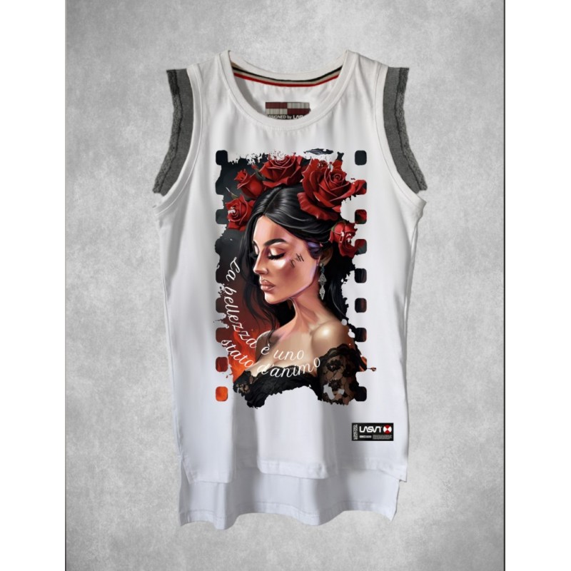 <p>Maxi print frontal de una mujer con rosas en la cabeza y la frase "La bellezza è uno stato d´animo".</p>