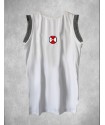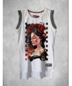 Camiseta exclusiva de mujer Joke Blanca. Camiseta en color blanco, sin mangas y con cuello redondo. Maxi print frontal de una payasita y un arlequín en tonos grises, destacando en tono azul el logo de la marca y la frase "LIFE IS A JOKE", junto con la rosa y otros elementos. Como detalle, la bola del gorro del arlequín representa el logo de la marca.