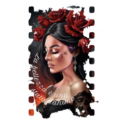 Maxi print frontal de una mujer con rosas en la cabeza y la frase "La bellezza è uno stato d´animo".