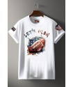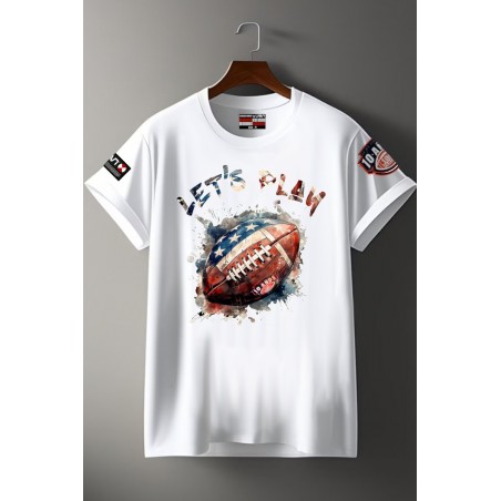 Camiseta Chico LASAL 100 Yardas Lets Play Blanco. Camiseta regular fit en color blanco con manga corta con vuelta. Dispone de estampación de 100 yardas en manga derecho y etiqueta plástica cosida en la izquierda. El estampado delantero de un balón de fútbol en clores de bandera americana bajo la frase "let´s play".