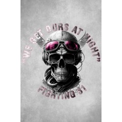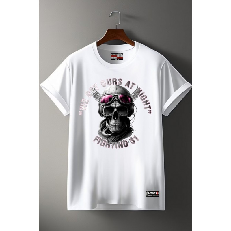 Camiseta Chico LASAL 31 Blanco. Camiseta de cuello redondo y manga corta, en color blanco, con dibujo frontal de inspiración aérea, con una calavera con casco de aviador y la frase "we get ours at night" y "fighting 31".