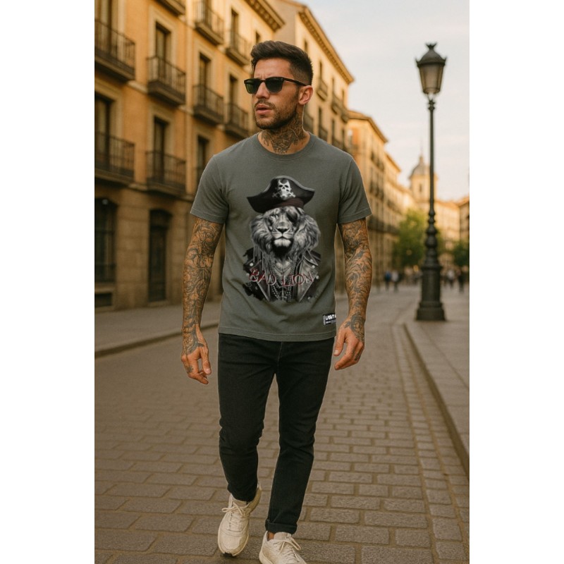 <p>Camiseta Chico LASAL Lion Pirate Gris. Camiseta regular fit, de manga corta, en color gris, con ilustración delantera de un león pirata en tonos negros y blancos y la frase "BAD LION" en roj</p>