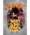 Camiseta exclusiva de mujer Joke Blanca. Camiseta en color blanco, sin mangas y con cuello redondo. Maxi print frontal de una payasita y un arlequín en tonos grises, destacando en tono azul el logo de la marca y la frase "LIFE IS A JOKE", junto con la rosa y otros elementos. Como detalle, la bola del gorro del arlequín representa el logo de la marca.