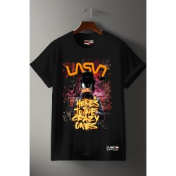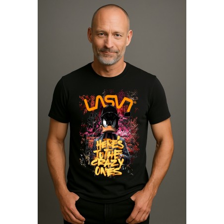 Camiseta Chico LASAL Duck Negra. Camiseta regular fit, de manga corta, en color negro, con ilustración delantera de del pato Lucas a todo color con el eslogan "HERE´S TO THE CRAZY ONES". Lleva la numeración aleatoria que caracteriza a la marca en la espalda (del 001 al 100), así como la etiqueta plástica cosida a la prenda en la parte delatera, garantizando así su originalidad.