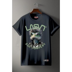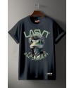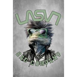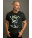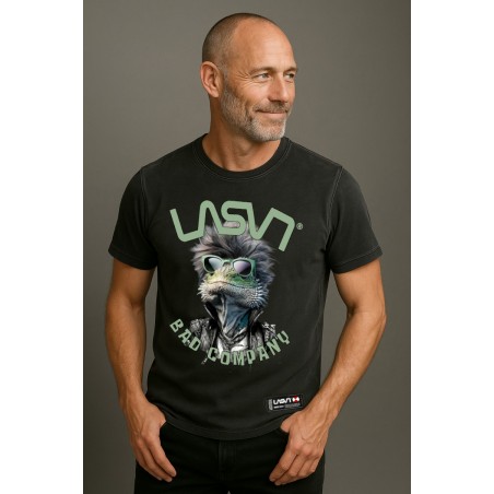 Camiseta Chico LASAL Bad Ka Negro Desgastado. Camiseta de manga corta, en color negro desgastado, con ilustración delantera de un dragón barbudo muy chic, con gafas de sol, y el eslogn "LASAL, BAD COMPANY" combinando colores verdes en un diseño muy top.