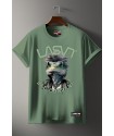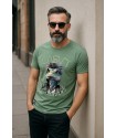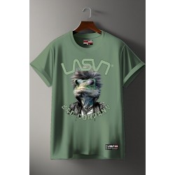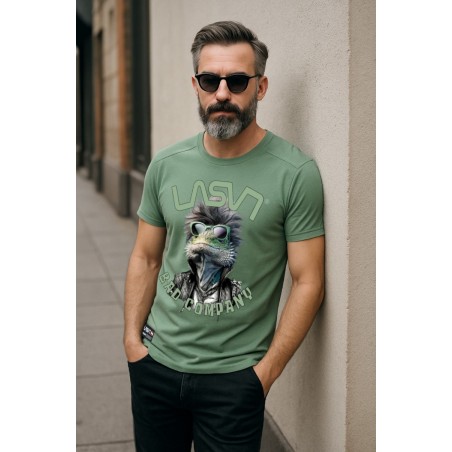 Camiseta Chico LASAL Bad Ka Kaki. Camiseta de manga corta, en color kaki, con ilustración delantera de un dragón barbudo muy chic, con gafas de sol, y el eslogan "LASAL, BAD COMPANY" combinando colores verdes en un diseño muy top.
