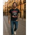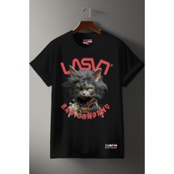 Camiseta Chico LASAL Bad Eyes Negro. Camiseta reguar fit, de manga corta, en color negro, con ilustración delantera de un gato gris muy cañero que se suma a las camisetas que ha realizado la marca con el eslogan "BAD COMPANY". La camiseta va numerada en la espalda (aleatorio del 001 al 100) y dispone de la etiqueta plástica que garantiza aún más su autenticidad en la parte baja izquierda delantera.