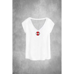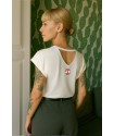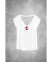 Camiseta exclusiva de mujer Joke Blanca. Camiseta en color blanco, sin mangas y con cuello redondo. Maxi print frontal de una payasita y un arlequín en tonos grises, destacando en tono azul el logo de la marca y la frase "LIFE IS A JOKE", junto con la rosa y otros elementos. Como detalle, la bola del gorro del arlequín representa el logo de la marca.