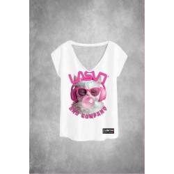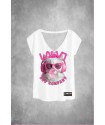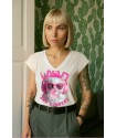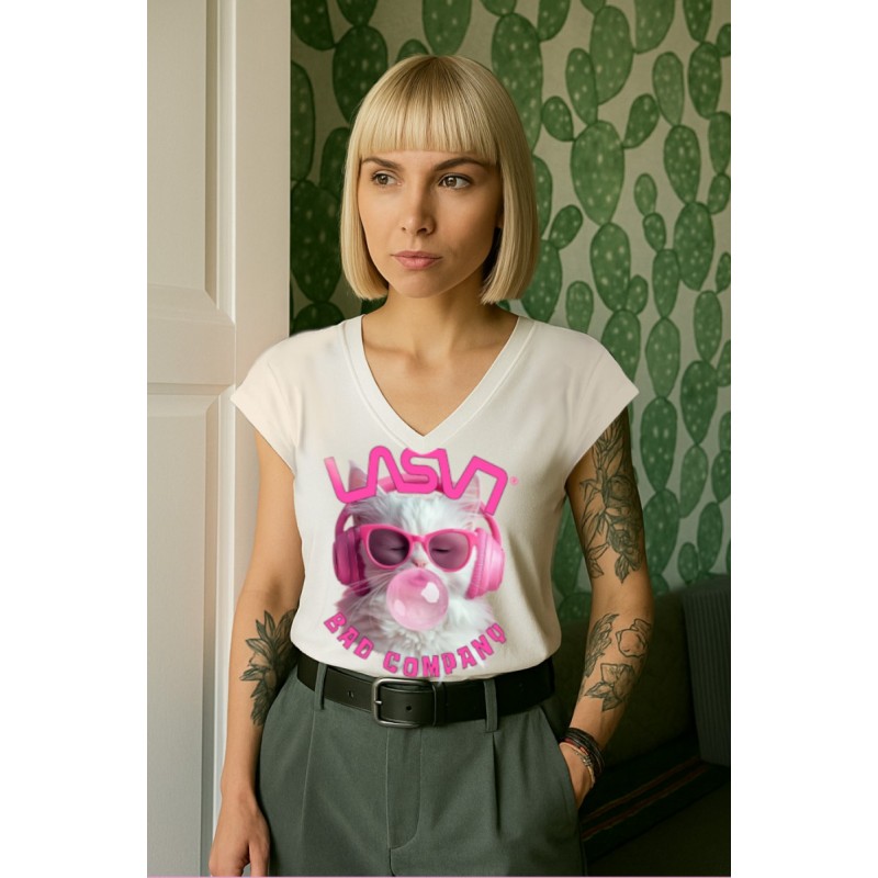 Camiseta exclusiva de mujer Cat Blanco. Camiseta en color blanco, de manga corta y cuello pico tanto en la parte delatera como en la espalda, la cual está reforzada con una tira para la mejor sujección de la prenda. Maxi print frontal de un gato blanco con sus gafas y sus cascos rosas y haciendo una pompa con un chicle, todo ello en los mismos tonos. Diseño de la colección "BAD COMPANY" en rosa y con un patrón poco habitual y muy cañero.